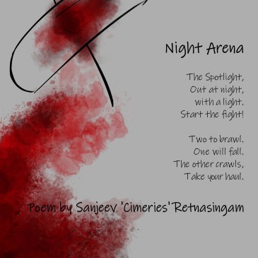 The Spotlight,Out at night,with a light.Start the fight!Two to brawl.One will fall.The other crawls,Take your haul.Poem By Sanjeev ‘Cimeries’ Retnasingam