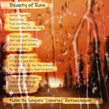 Pitter Patter. Footsteps. Pain shatters, Tossed into the depths. Freezing cold. Not cold, but breezy. A new world unfolds. Nice and easy. As the fresh scent Of grass and dirt Fills the air. So too the crescent. So too the stars that’re birth. The nature of malice Slides off the mind. Purify the chalice In … More Beauty of Rain